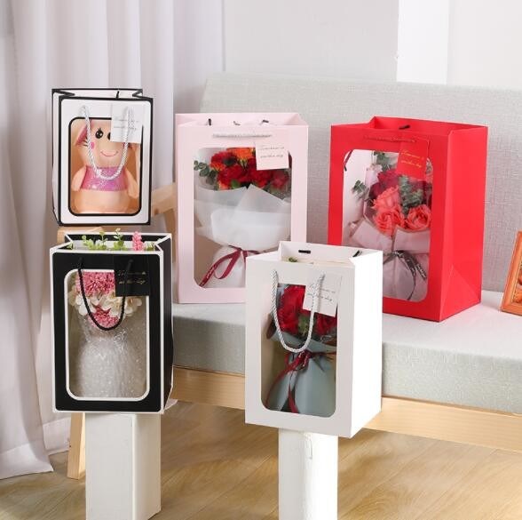 Cardboard Paper Gift Packing Bag with window Environmental Friendly white pink black