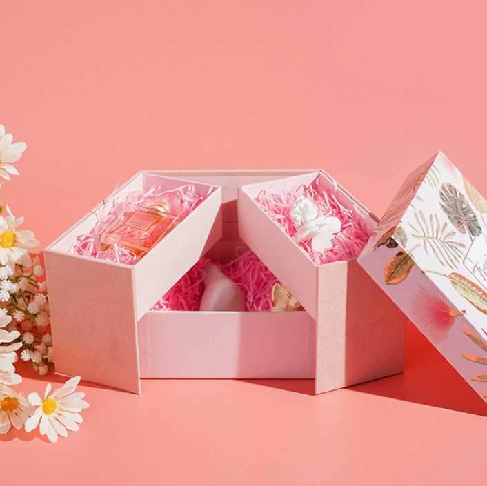 Double Layer Cardboard Gift Packaging Boxes creative first layer could be opened pink gray